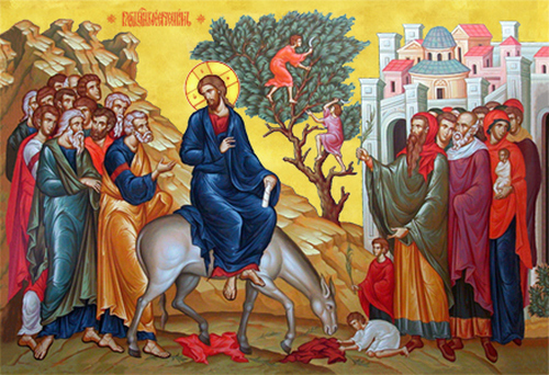 „…ერი მრავალი, რომელ-იგი მოსრულ იყვნეს დღესასწაულსა მას, რამეთუ ესმა, ვითარმედ იესო მოვალს იერუსალემდ, მოიღეს რტოები დანაკის კუდთაგან და განვიდეს მიგებებად მისა, ღაღადებდეს და იტყოდეს: ოსანა! კურთხეულ არს მომავალი, მეუფე ისრაელისაი!“, – ასე აღწერს იოანე მახარებელი მაცხოვრის იერუსალიმში დიდებით შესვლის ამბავს.
